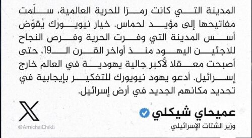 بعد فوز ممداني برئاسة بلدية نيويورك.. وزير الشتات الإسرائيلي يصف ممداني بـ”مؤيد لحماس” ويدعو يهود المدينة إلى الهجرة نحو إسرائيل، معتبرا أن انتخابه “نقطة تحول حاسمة” في تاريخ المدينة التي تضم أكبر جالية يهودية بالعالم.