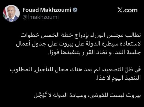 في ظلّ التصعيد، لم يعد هناك مجال للتأجيل. المطلوب التنفيذ اليوم لا غدًا… بيروت ليست للفوضى، وسيادة الدولة لا تُؤجَّل!