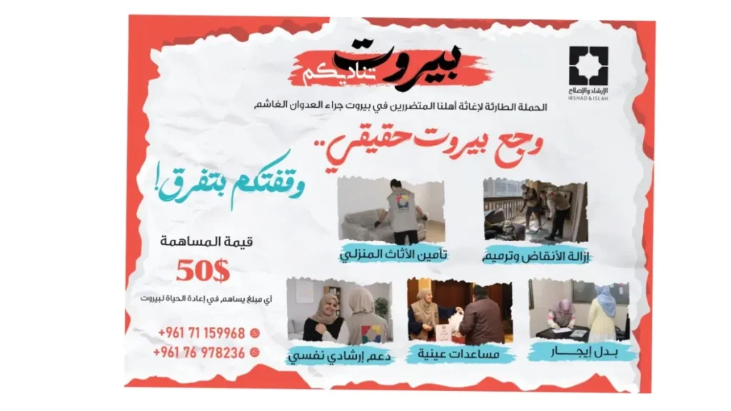 أطلقت “جمعية الإرشاد والإصلاح”، إثر العدوان على مدينة بيروت، حملة إغاثية عاجلة تحت عنوان “بيروت تناديكم” لدعم الأسر المتضررة، تشمل مسح الأضرار وتنظيف المنازل من الزجاج والحطام، وترميم المنازل المتضررة جزئيًا، إلى جانب الدعم النفسي، وتوجهت ب”نداء إنساني عاجل إلى أهل الخير والأيادي البيضاء” للمشاركة إلى جانبها في هذا العمل الإنساني.