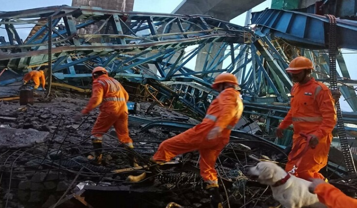 وأظهر مقطع فيديو نشرته الوكالة الوطنية الهندية للاستجابة للكوارث عناصر إنقاذ يبحثون في أكوام من العوارض الفولاذية المحطّمة في موقع البناء في تاني في ضواحي بومباي.