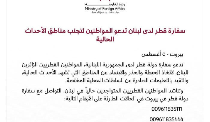 وناشدت المواطنين القطريين الموجودين حاليًا في لبنان التواصل مع سفارة دولة قطر في بيروت في الحالات الطارئة على الأرقام التاية: