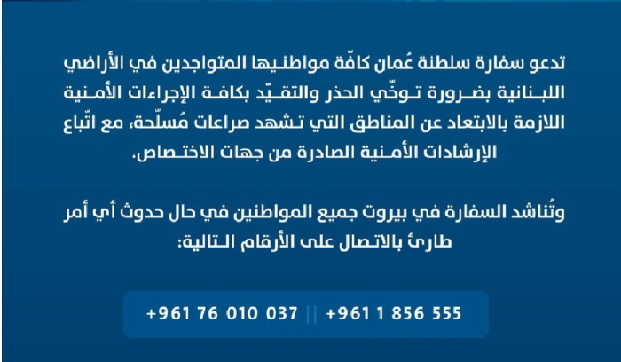 دعت سفارة سلطنة عمان لدى بيروت، في بيان عبر منصة “اكس”، مواطنيها الموجودين على الأراضي اللبنانية إلى ضرورة توخي الحذر والتقيّد بالإجراءات الأمنية اللازمة بالابتعاد عن المناطق التي تشهد صراعات مسلّحة، مع اتّباع الإرشادات الأمنية الصادرة من جهات الإختصاص. وطلبت السفارة من جميع المواطنين في حال حدوث أي أمر طارىء، الإتصال على الأرقام التالية: